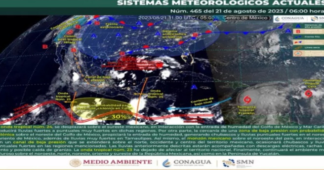 El Servicio Meteorológico Nacional reveló, qué la onda tropical número 24, se desplazará a partir de éste lunes 21 de agosto, sobre el sureste mexicano, en interacción con la entrada de humedad del Golfo de México y Mar Caribe, situación que producirá lluvias fuertes a puntuales muy fuertes en dichas regiones.